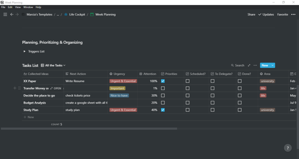 One is focused to record all the tasks you need to complete. This database is related to your outcomes, so you can continue tracking your goals.