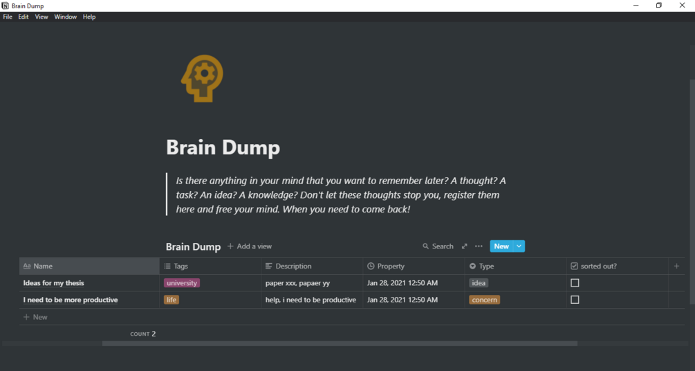 - A Braindump template that aims to save all your thoughts, ideas, and knowledge that you want to register in a place organized for later organization.